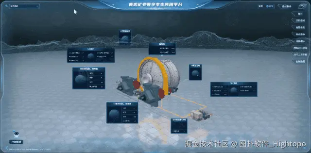 该场景覆盖全矿区设备的智能化管理体系。模块对 10 类 31 台关键生产设备进行 L5 级精细化建模,对 124 台其他生产设备完成设备级建模。场景内搭配图扑 HT 丰富的 2D 图形组件,实时呈现出设备运行参数、启停状态、预警报警信息,并具备备品备件到期自动预警、设备履历全生命周期追溯、多维度报警统计、运行指标实时统计等功能,为设备运维培训、故障排查、精准管控提供全方位支撑。