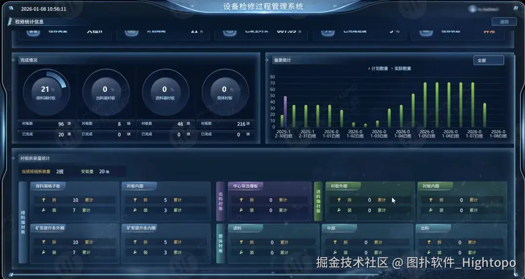 系统实时掌控设备全局检修进度,依托三维模型直观呈现衬板拆装等关键工序的推进情况;通过全局进度把控与工期智能预测,辅助管理层科学决策,保障检修工作高效、安全、有序开展。同时,从班组完工数量、用时、故障事件、备件损耗等多维度,对作业细节进行定量与定性综合评价,实现班组绩效精准管控。