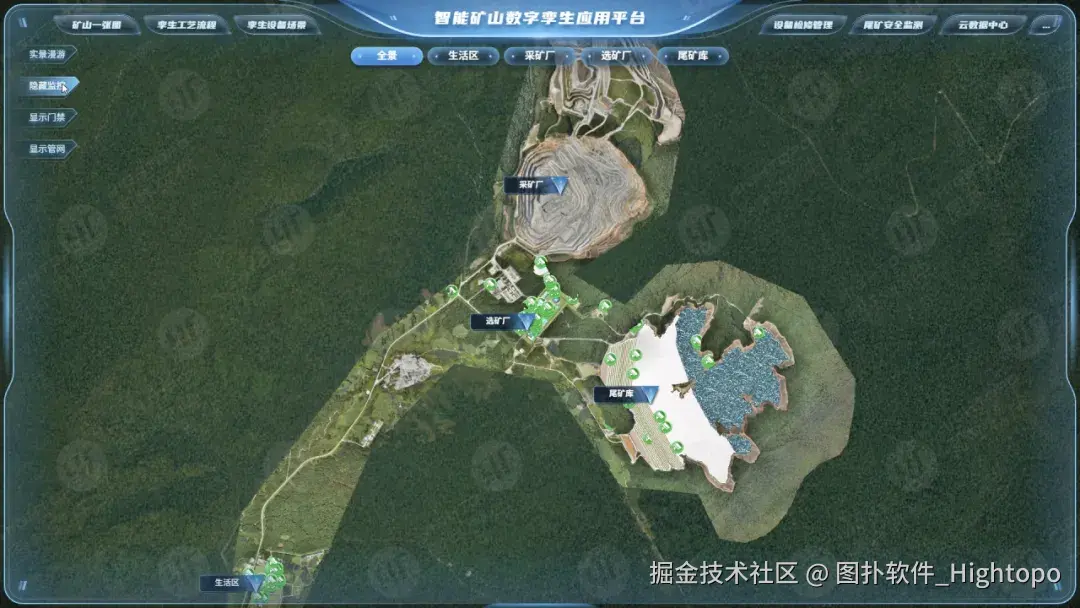 系统以三维虚拟场景为基础,全面覆盖生活区、采矿厂、选矿厂(含尾矿区)及各核心生产车间全域。通过高保真数字化模型与实时数据深度融合,实现全厂区可视化精准管控。