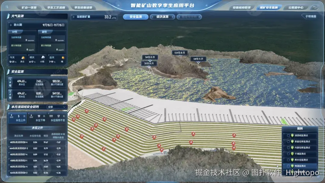 尾矿安全管理模块依托图扑 HT 数字孪生对尾矿坝安全稳定性进行全面评估,构建起覆盖安全监测、放矿推演、调洪演算的全方位安全管理体系。为尾矿库安全风险防控与科学决策提供全生命周期运维支撑,保障矿山运营安全。