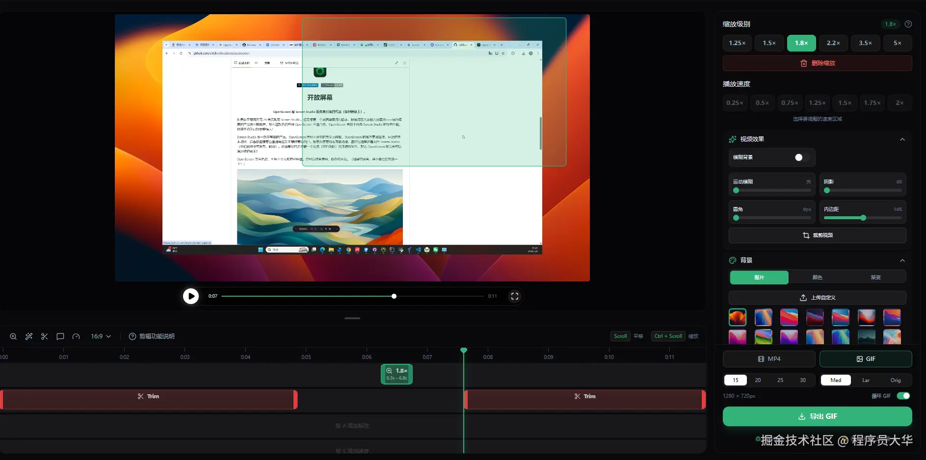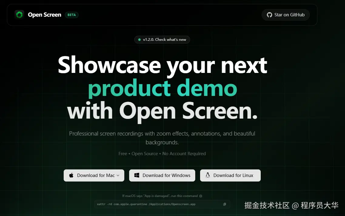 它打的口号正中我的痛点:免费、高清、无水印、可商用,做 Screen Studio 的开源替代品。