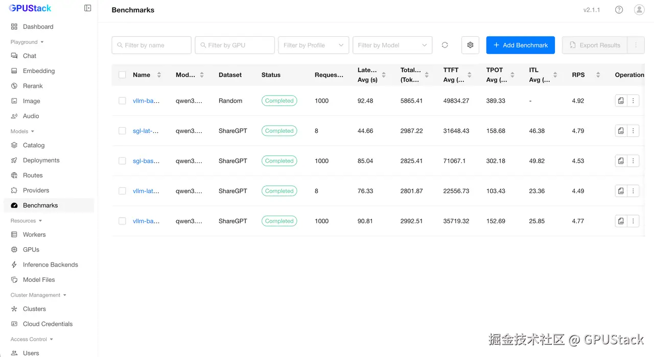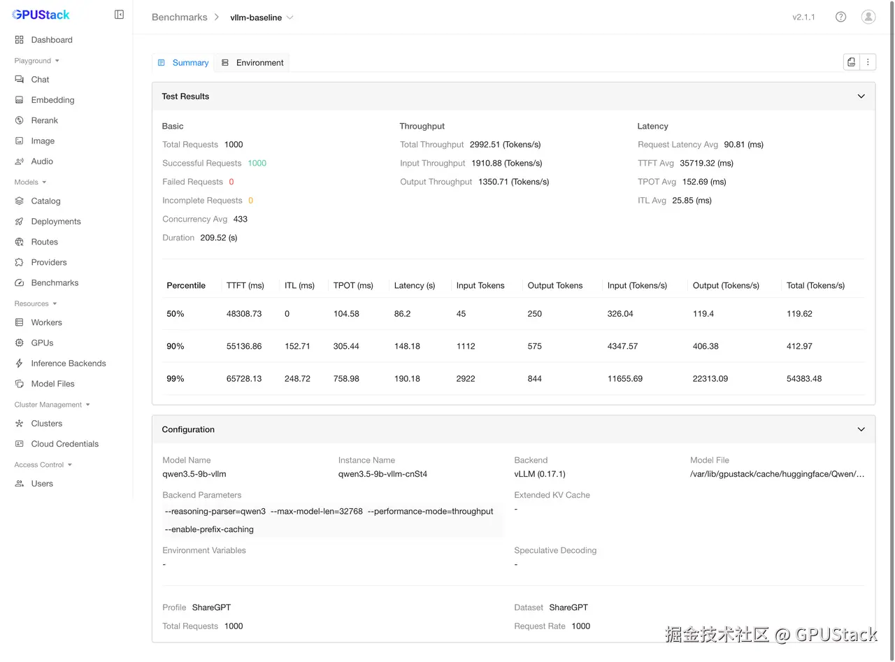 从这个角度看,GPUStack 更像是把部署、benchmark、结果查看和配置记录放在了一条链路里。这样做的意义,不是替实验下结论,而是让结论更容易回到原始实验里核对。