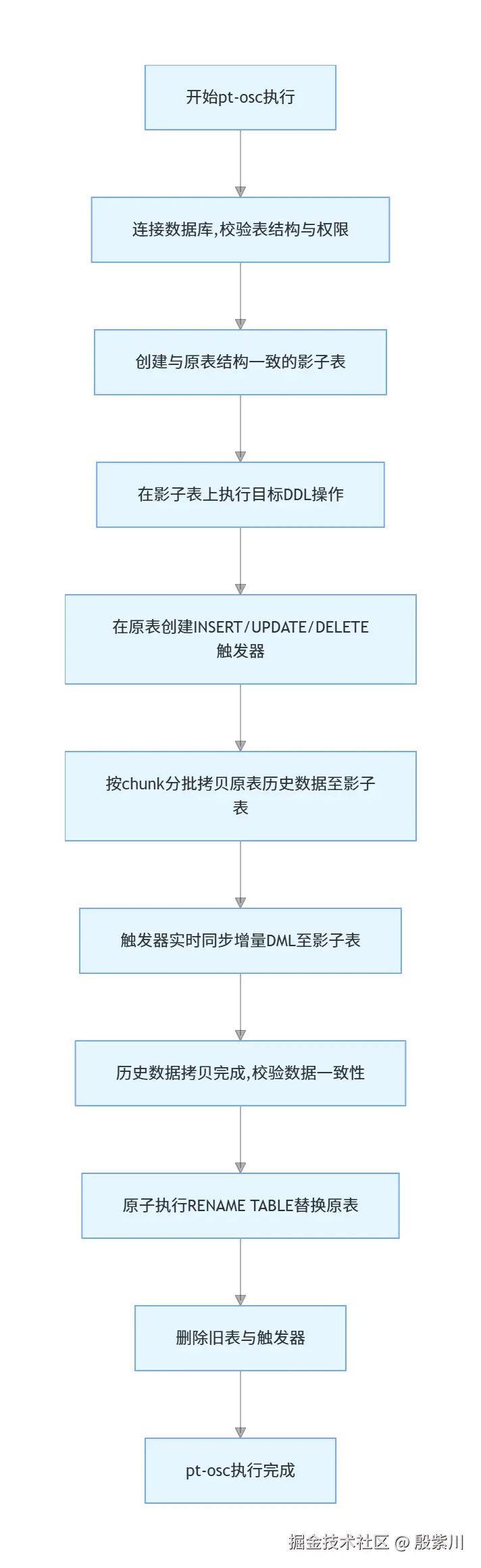 pt-osc的核心是通过触发器实现增量数据的实时同步,将大表的全量数据拷贝拆分为多个小chunk分批执行,避免长时间锁表。其完整执行流程如下: