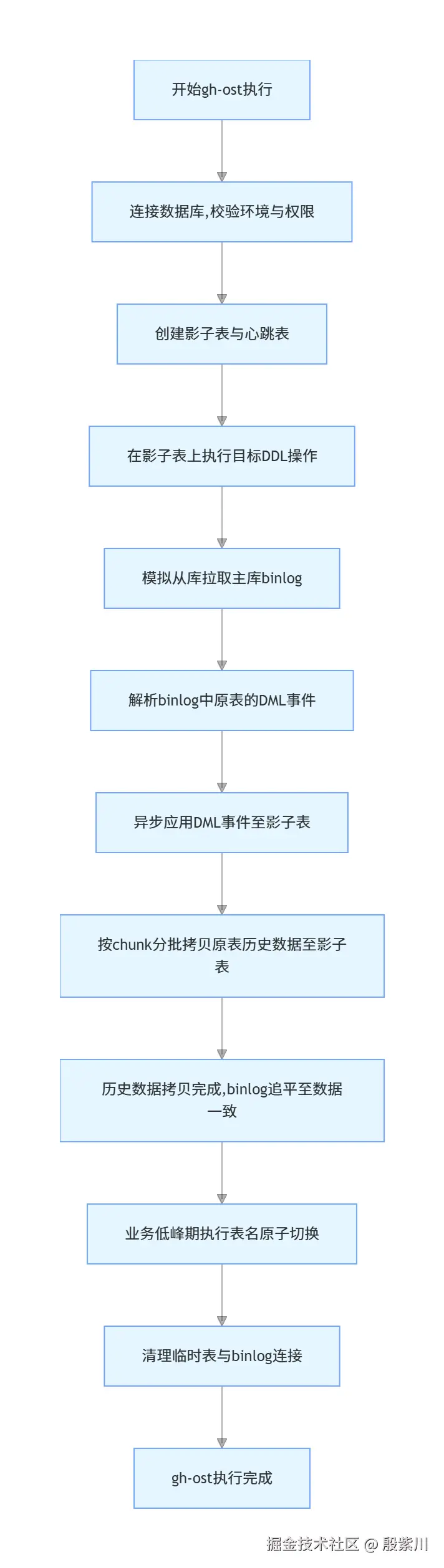gh-ost的核心是基于binlog的增量同步,无任何触发器侵入,将表结构变更的全流程解耦为历史数据拷贝与增量数据同步两个独立的流程,全程可控性极强。其完整执行流程如下:
