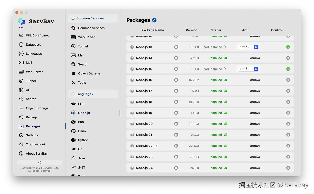 ServBay 支持在本地一键部署 Node.js 环境,根本不用手动处理环境变量。在 ServBay 中完成 Node.js 初始化后,在终端执行几行命令即可快速上手.