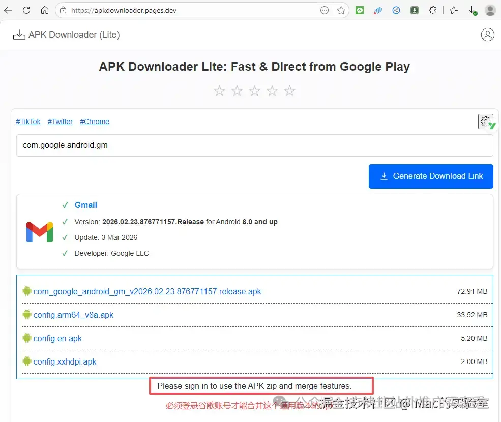 另外下载一部分Apk还需要登录谷歌账号处理「合并Apk」,例如GMail就需要合并,所以这就“套娃”了。
