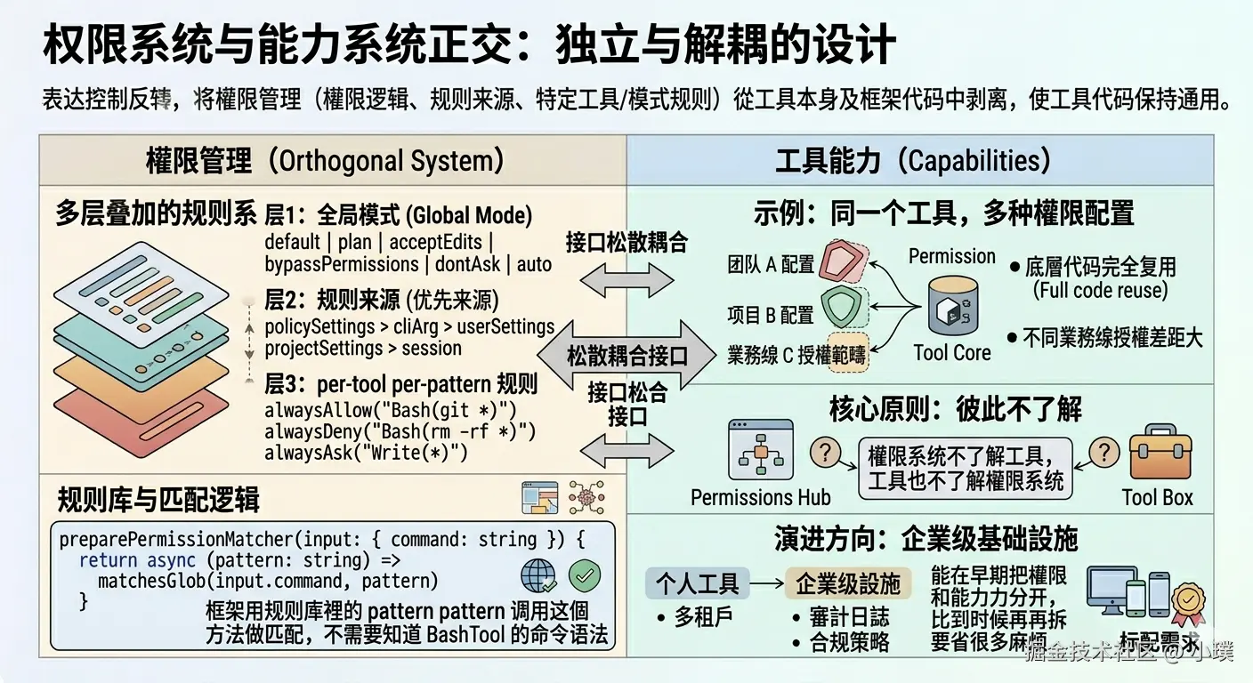 框架用规则库里的 pattern 调用这个方法做匹配,不需要知道 BashTool 的命令语法。权限系统不了解工具,工具也不了解权限系统,两者通过这个接口松散地耦合在一起。