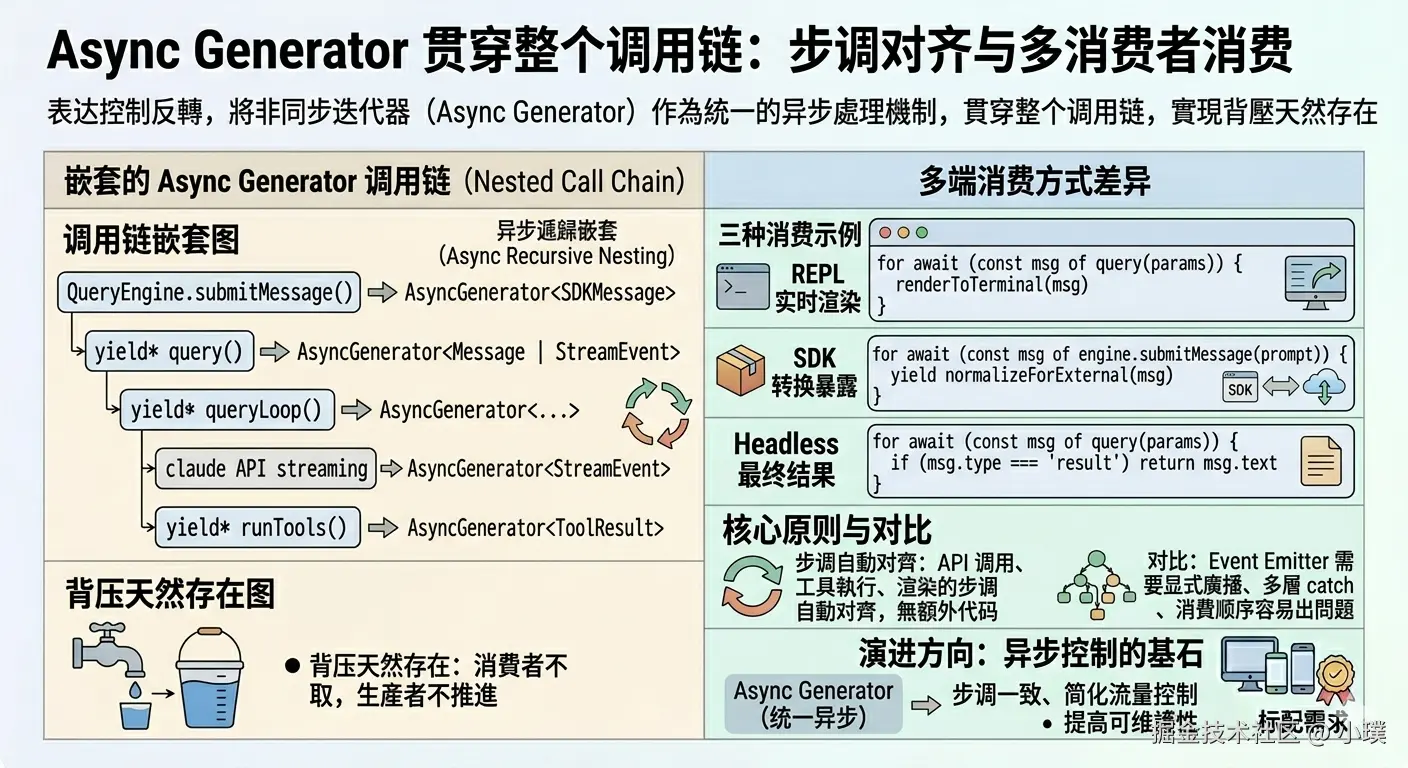 用 Event Emitter 做这件事,多消费者需要显式广播,错误需要在每层 catch 之后再 emit,消费顺序也容易出问题。Generator 的消费是线性的,背压天然存在——消费者不取,生产者不推进。API 调用、工具执行、渲染的步调自动对齐,不需要额外的流量控制代码。