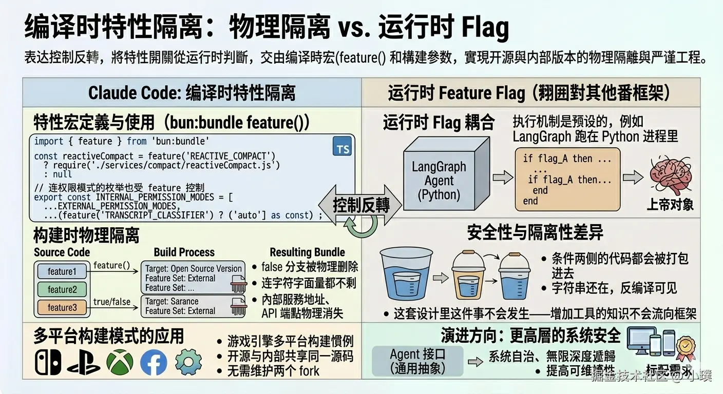 用运行时 feature flag 做不到这点——条件两侧的代码都会被打包进去,字符串还在,反编译就能看到。内部服务地址、未发布功能名称、实验性 API 端点,需要物理消失才算真正隔离。