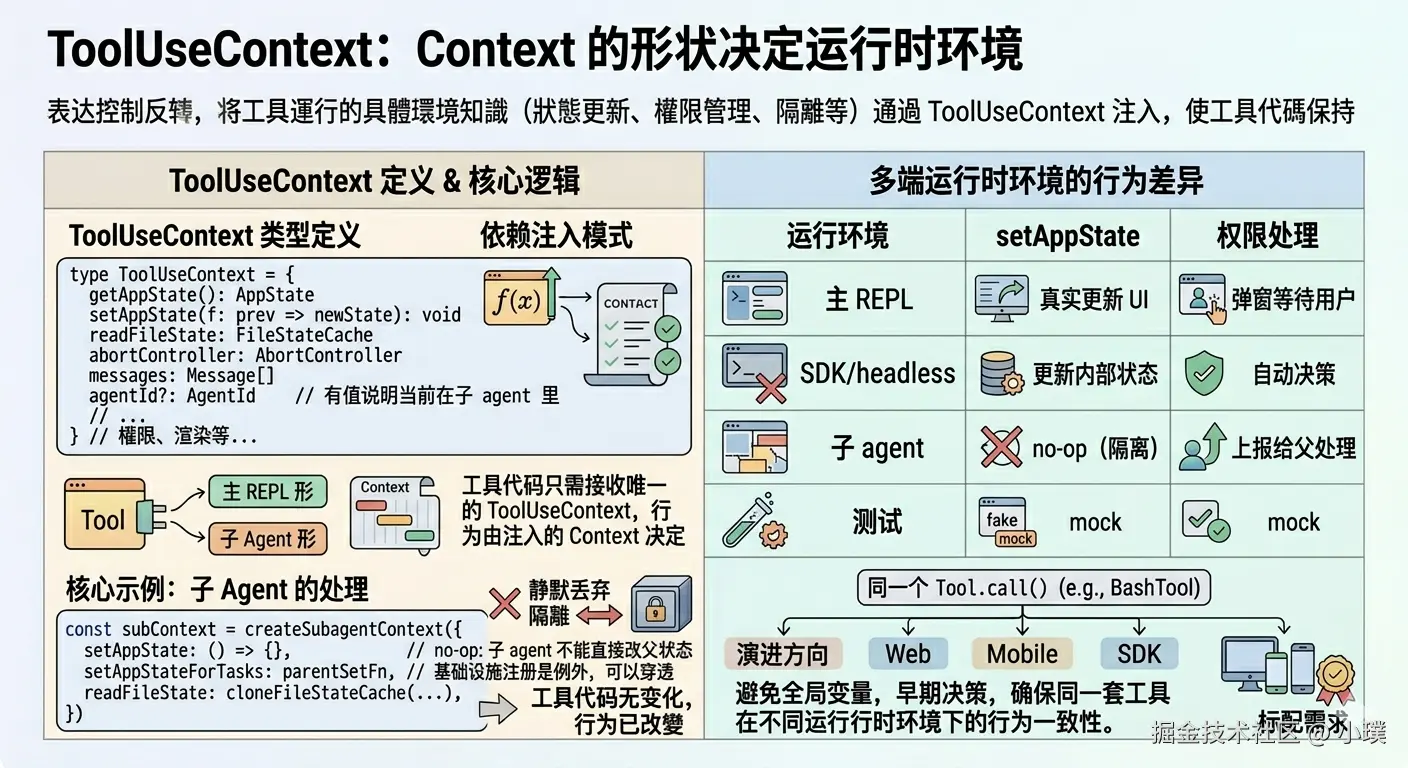 子 agent 拿到的 Context,setAppState 是个空函数。工具代码本身没有任何变化,但在子 agent 里执行时,所有状态更新都被静默丢弃。Context 的形状决定了行为: