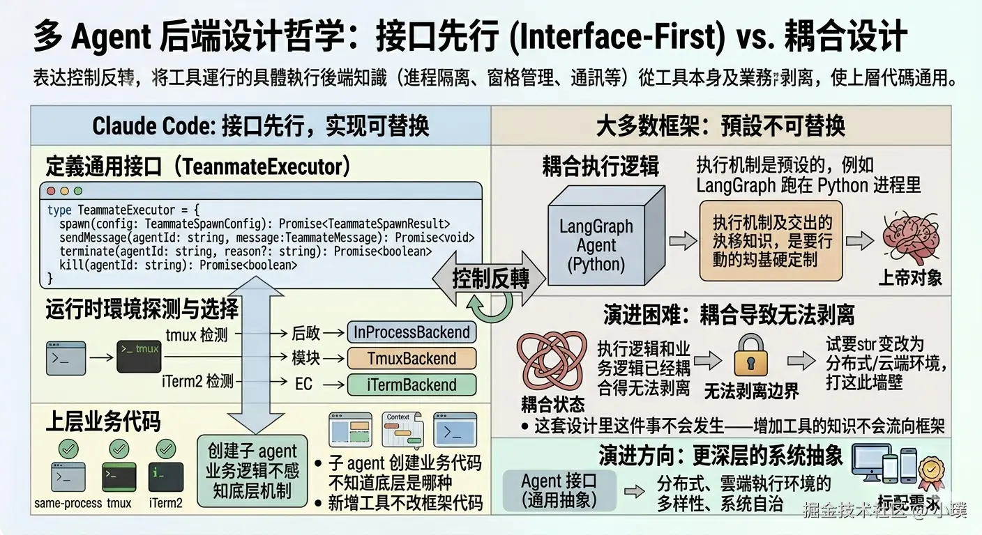 运行时根据当前环境探测选择后端:在 tmux 里就用 TmuxBackend,在 iTerm2 里就用 ITermBackend,都不满足就 fallback 到 InProcessBackend。创建子 agent 的业务代码不知道也不需要知道底层是哪种。