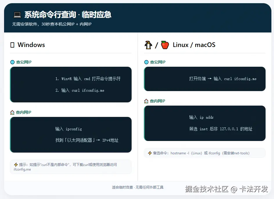 无需安装任何软件,利用系统自带命令,30秒快速查询本机公网/内网IP,适合临时自查。