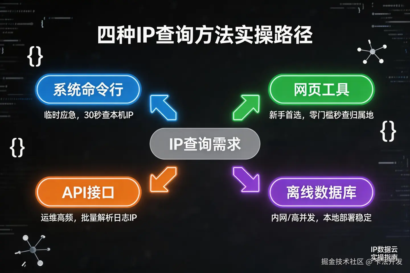 除了搜索引擎,命令行、网页工具、API接口、离线数据库,都是更高效的IP查询方法,可按需选择。IP数据云凭借精准解析能力、多样化使用形式,覆盖个人自查到企业运维全场景,无需复杂操作,大幅提升IP查询、属地核验、日志分析效率,适配多平台使用场景,是运维和日常IP处理的可靠工具。