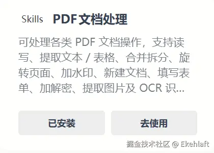 打开AiPy,首先安装 PDF文档处理 skill ,点击去使用