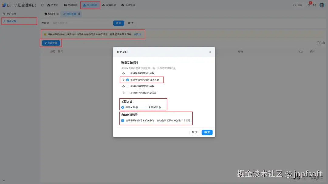 管理员登录系统后,可在“身份管理”模块选择“自动关联”,勾选“手机号”作为关联规则,点击确认即可批量将各子系统用户与平台用户绑定;若需新增应用,在“应用管理”中点击“+新建”,上传应用LOGO、填写名称及申请理由,提交后即可完成基础配置。