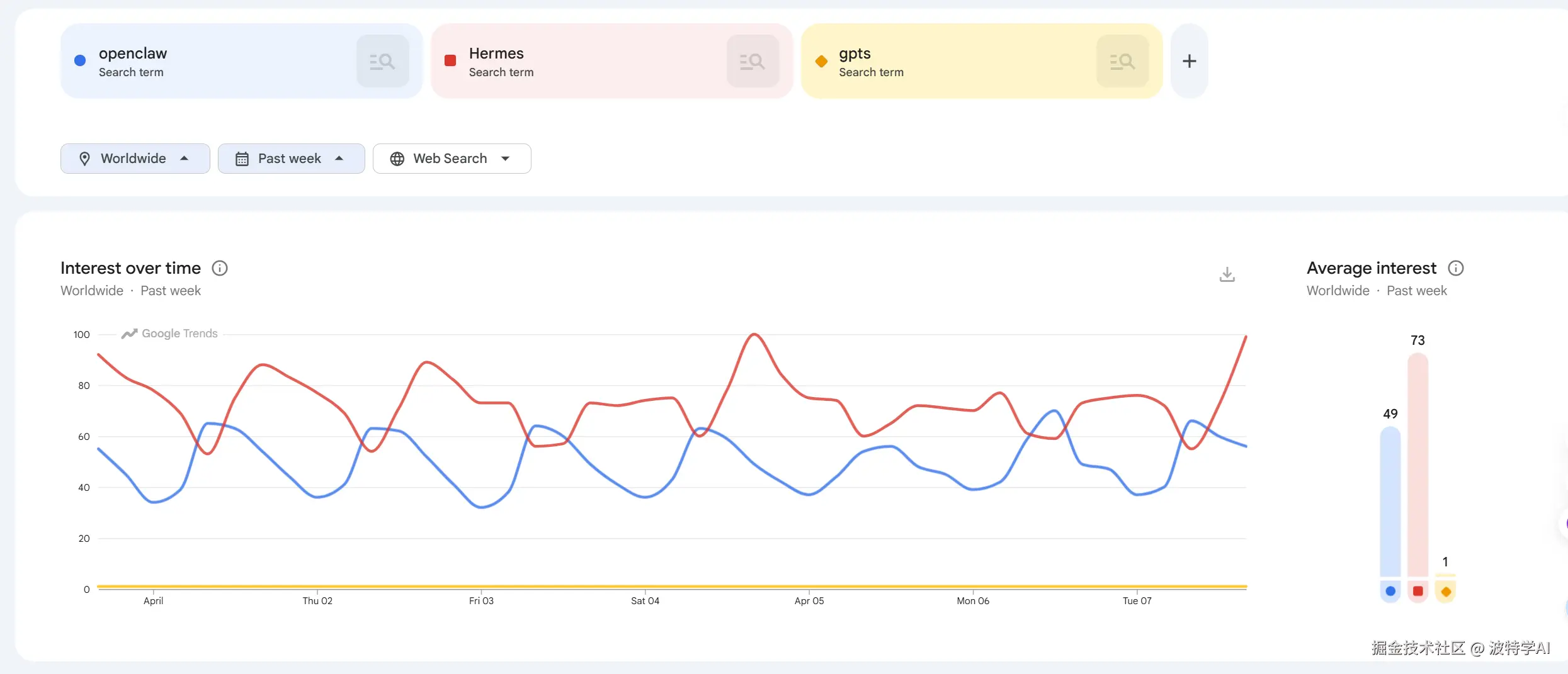 最近大家吐槽 OpenClaw 不好用的呼声越来越高,刚好在X上发现不少人都在讨论 Hermes, 说它可能是龙虾自诞生以来最强的竞争对手,我去 Google 趋势上查了一下,发现它的热度明显已经超过 OpenClaw ,大有取缔之意,于是我也安装了一个试试效果。