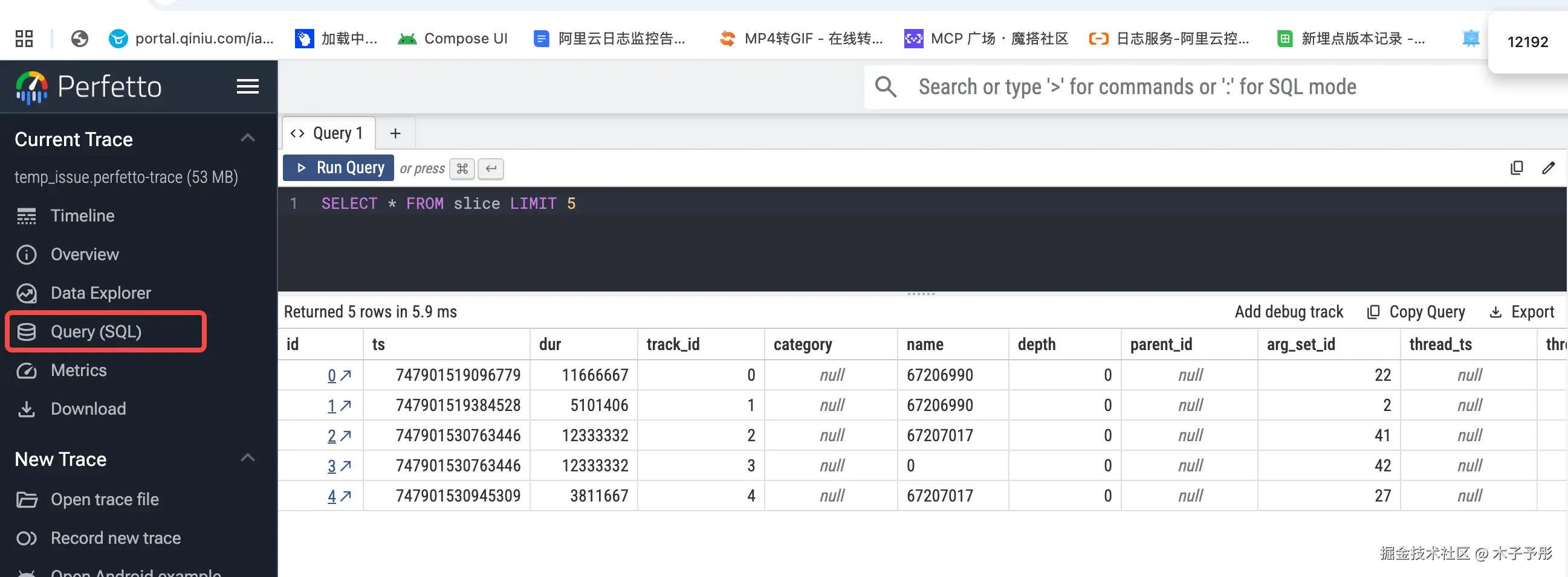 在 ui.perfetto.dev 快捷查询,把 Trace 文件拖入 Perfetto UI,选择 SQL 模式执行 SQL 语句即可。