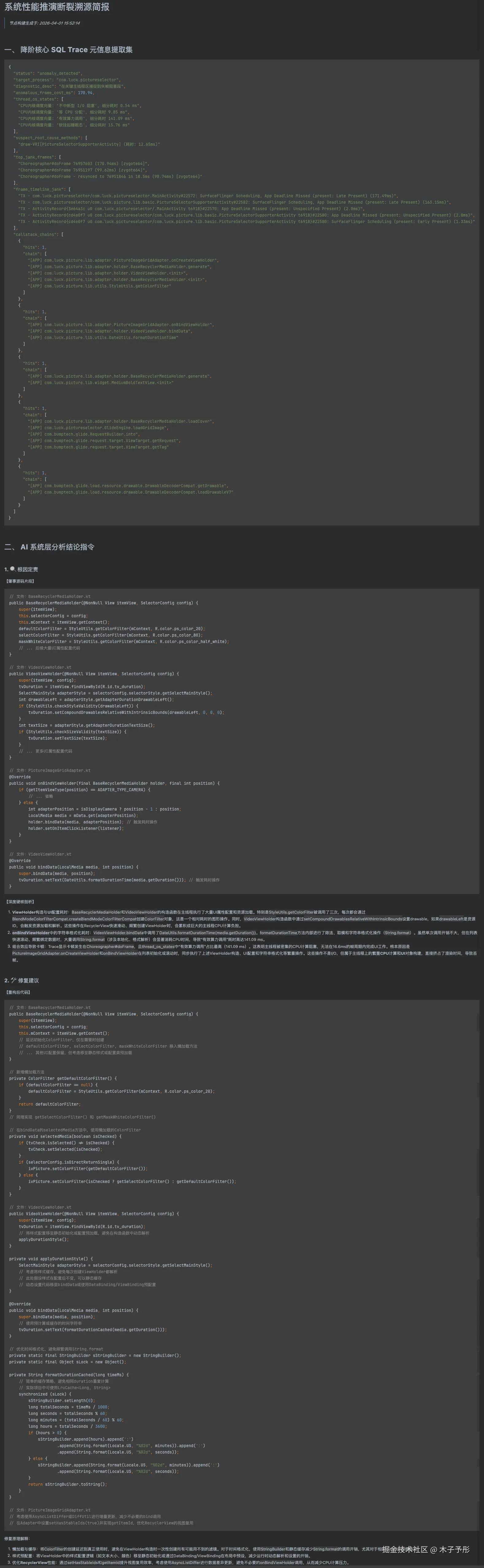 经过强约束模板调优后,即使是复杂的嵌套布局或第三方列表滑动卡顿,AI 引擎也能精准输出肇事源码片段与针对性修改建议: