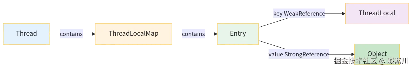 ThreadLocal 的实现涉及三个核心组件:Thread、ThreadLocal、ThreadLocalMap,它们的关系如下: