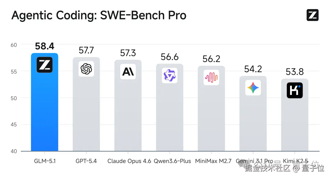 在被称为 “软件工程能力试金石” 的 SWE-bench Pro 基准测试中,GLM-5.1 刷新了全球最佳成绩,直接超越 Claude Opus 4.6、GPT-5.4 等一众头部模型,拿下全球第一: