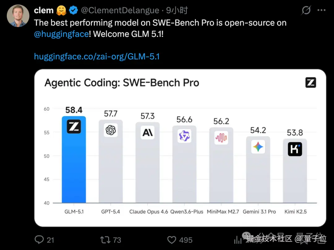HuggingFace CEO 也出面站台,称 SWE-Bench Pro 中性能最强的模型开源了: