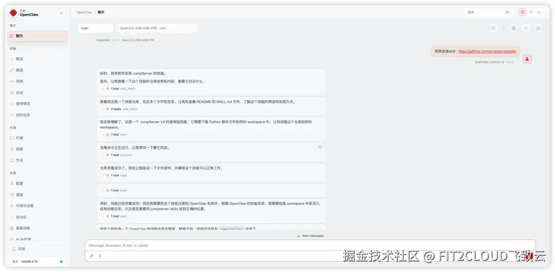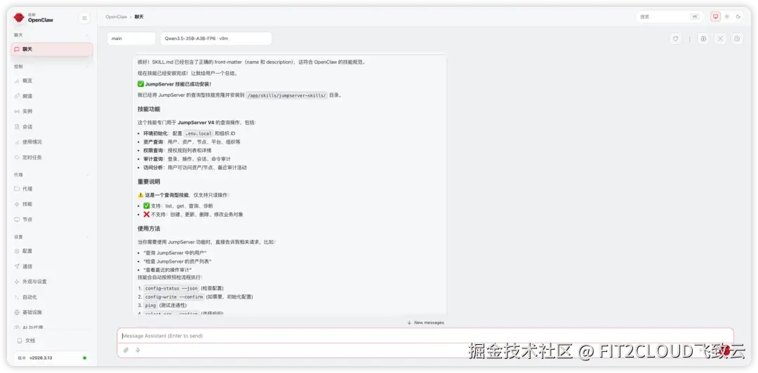 ③ 通过OpenClaw对话,一键自动安装JumpServer Skills。