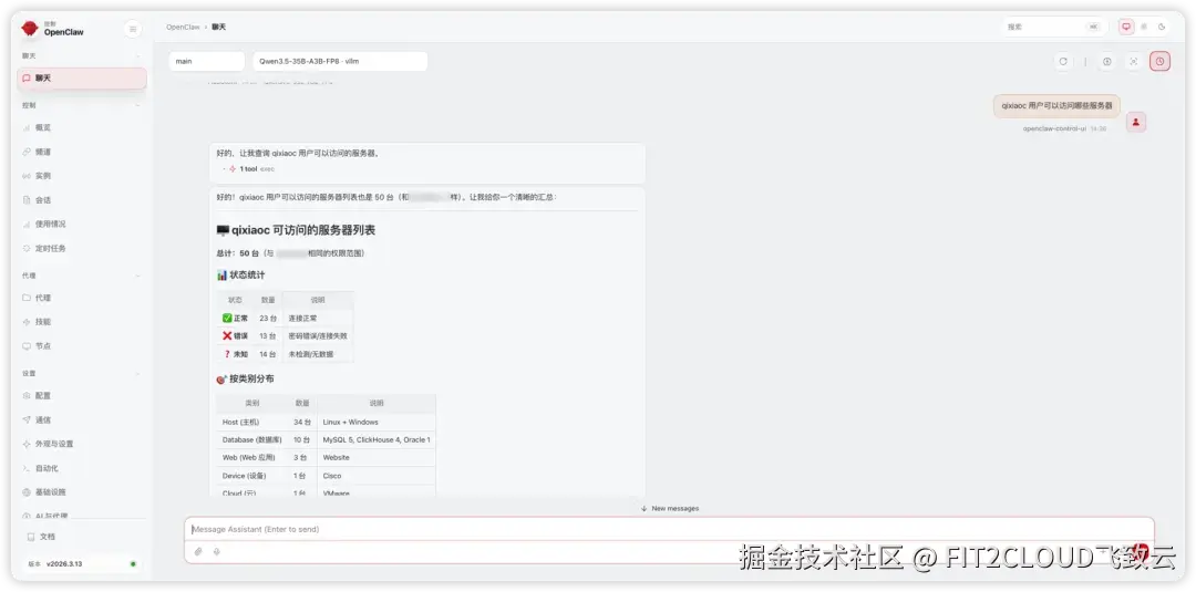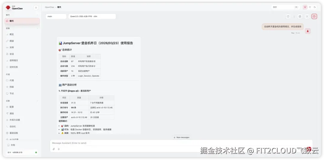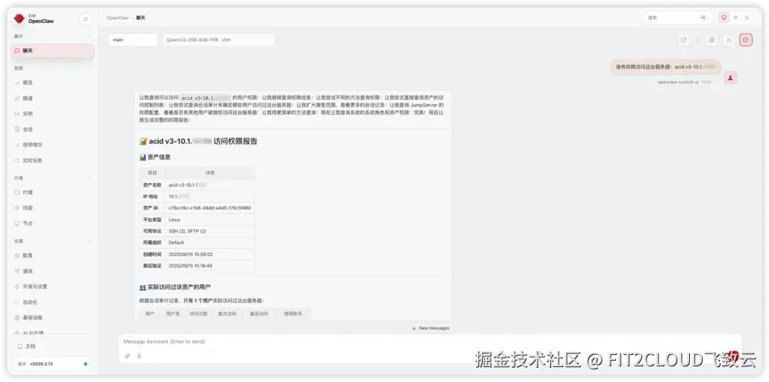 在安装了JumpServer Skills之后,您可以使用自然语言与OpenClaw对话,让其在JumpServer中进行资产查询、权限查询、追溯审计、报告生成等操作。