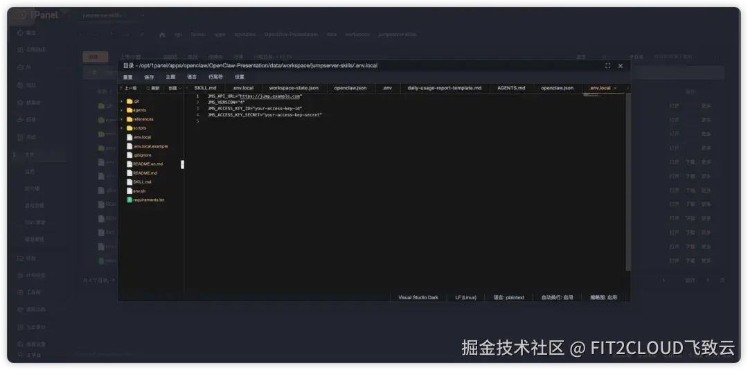 进入技能目录创建.env.local文件,填写您的JumpServer服务地址与API密钥(注:JumpServer社区版API调用默认有流量限制,企业版可以打开限制)。您也可以通过OpenClaw的自然语言对话界面,直接提供配置参数,具体操作步骤如下: