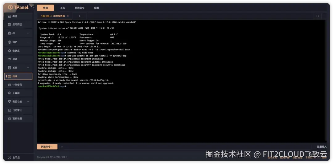 ① 通过1Panel部署的OpenClaw,在安装该Skills前,需要进入到容器内部,手动执行以下命令提升权限,并安装相应依赖;