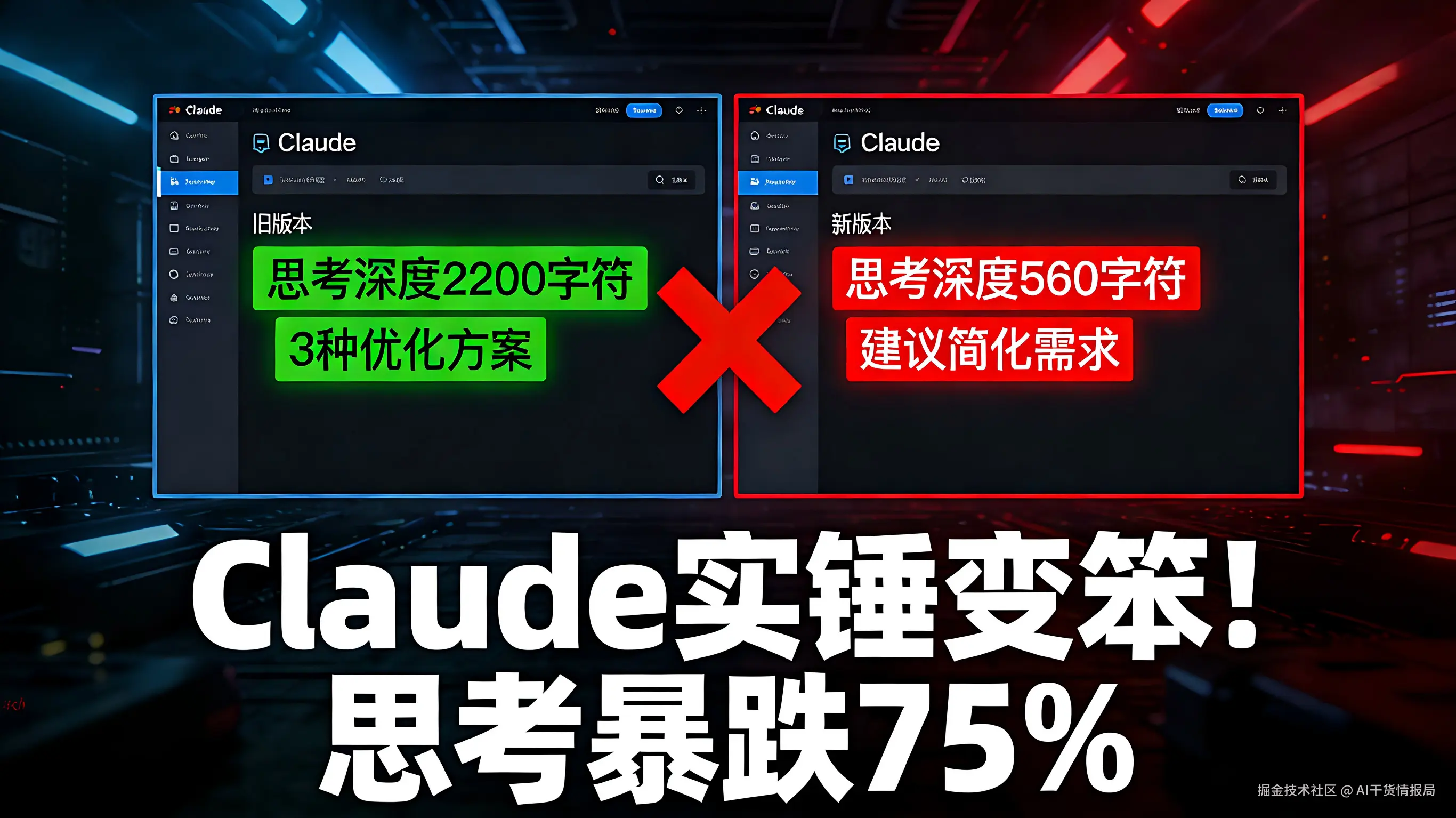 核心数据扎心到离谱:思考深度从原来的2200字符,直接砍到560字符,暴跌75%;复杂代码编写、多步骤逻辑推理直接拉胯,以前能轻松搞定的多模块编程,现在连基础语法错误都查不出来。