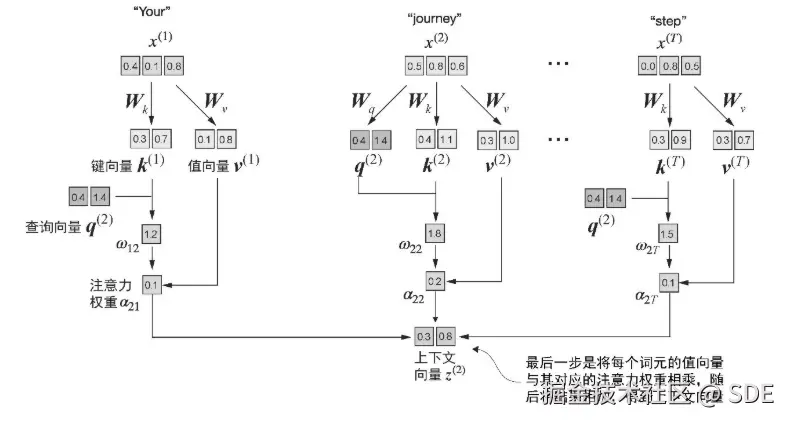 比如我们现在只看第二个 Token,它的上下文向量 是这样来的: