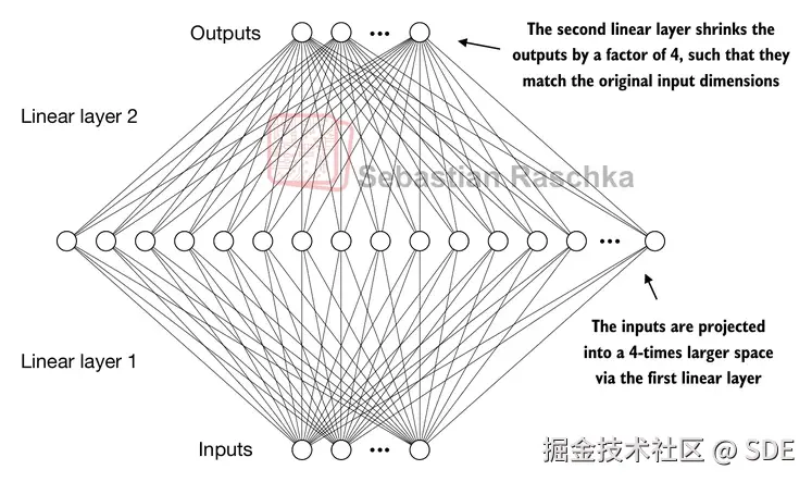 - 扩大维度:把输入从 768 维(假设是 GPT-2 的嵌入维度)扩大到 3072 维(4 倍)。