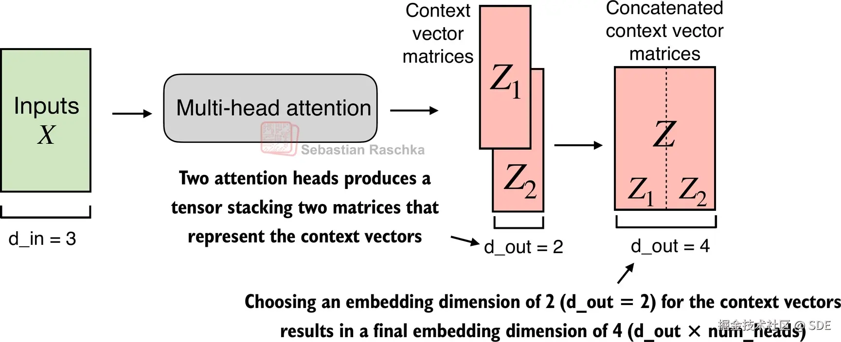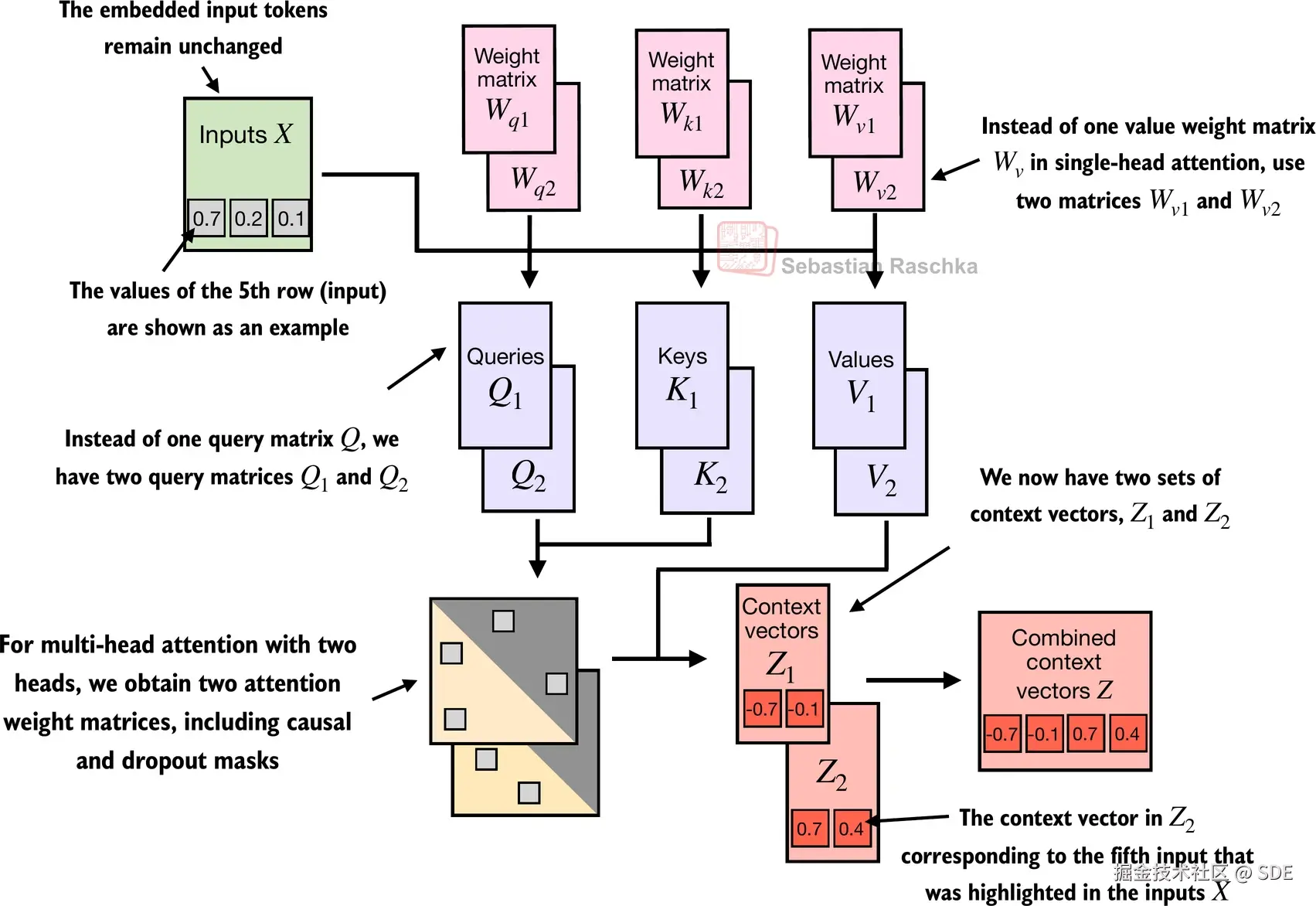 因此,我们不是使用一个单一的矩阵 W_v 来计算值矩阵,而是在一个有两个头的多头注意力模块中,现在有两个值权重矩阵:。这样同样适用于其他的权重矩阵,比如 。
