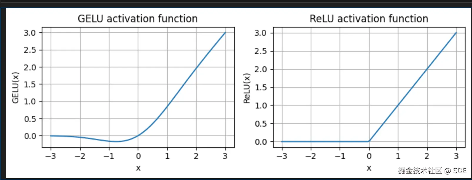 - GELU 激活:对每个元素应用 GELU 函数。比如 -0.3 经过 GELU 后可能变成 -0.05(很小的负数,但不是 0)。这一步引入非线性,让模型能学到更复杂的模式。