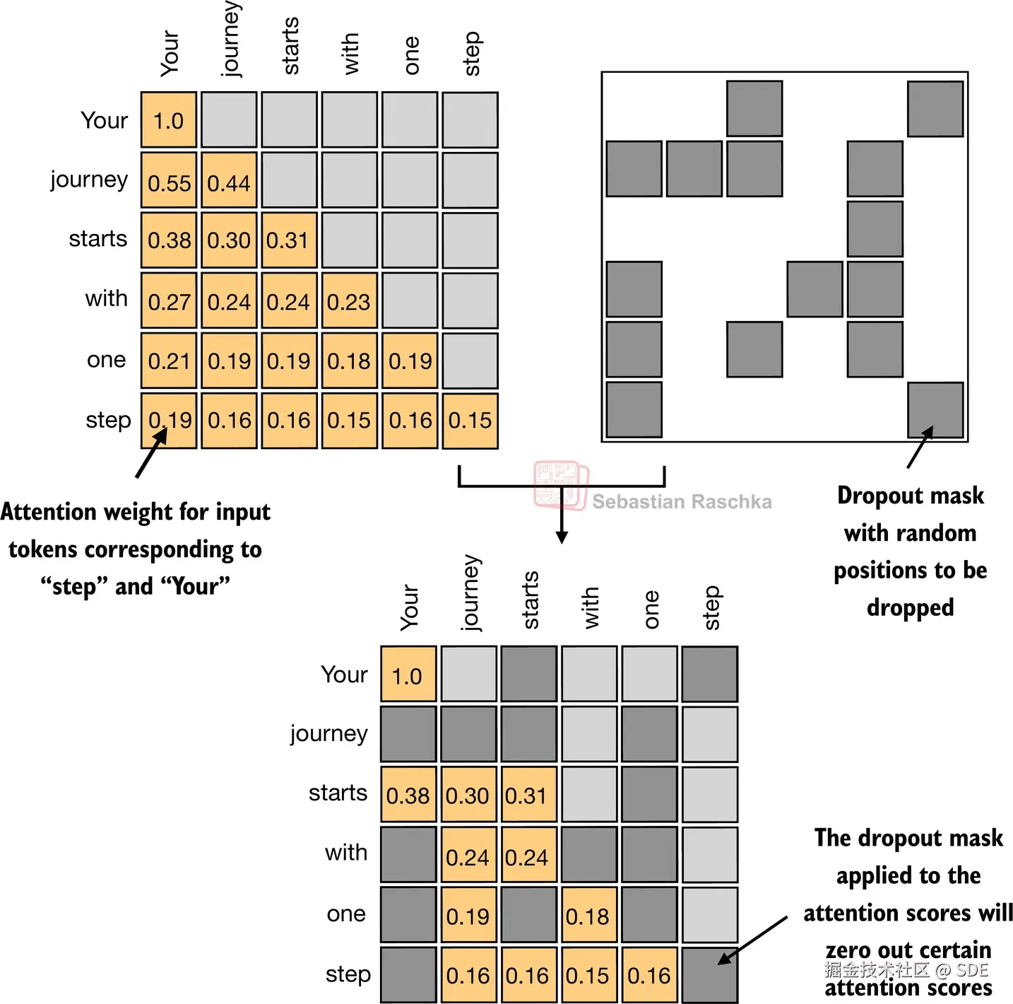 例如,假设某个词元的注意力权重向量是 [0.1, 0.3, 0.4, 0.2],总和为 1.0。如果 dropout 随机丢弃了第 3 个权重(0.4),那么剩下的权重 [0.1, 0.3, 0.2] 会被按比例放大到 [0.167, 0.5, 0.333],使得总和仍然为 1.0。这样,模型在训练时不能总是依赖同一条注意力路径,必须学会更鲁棒的特征表示。