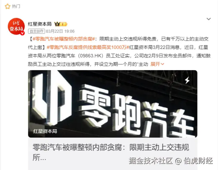 前段时间,坊间有传闻某车企在内部搞反腐,一时间社交媒体上议论纷纷,有说传统车企的,也有说头部新势力的,但有媒体揭开答案后又很意外,没人想到主角居然零跑。