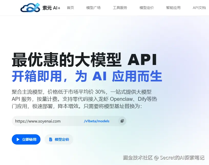 这是个 API 服务平台,接入了 40 多个主流大模型。早期我每个模型都要单独注册账号,API Key 存得到处都是,账单分散,不知道钱花哪了,文档格式还不统一。后来发现了索元 AI+,一个平台全搞定。