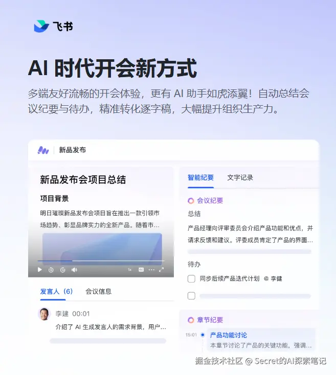 我每天都有各种会议和对话。早期靠手记,后来发现记不全、整理慢、时间久了找不到。飞书妙记帮我解决了这些问题:自动录音转文字,自动区分发言人,自动生成摘要,还支持搜索和归档。
