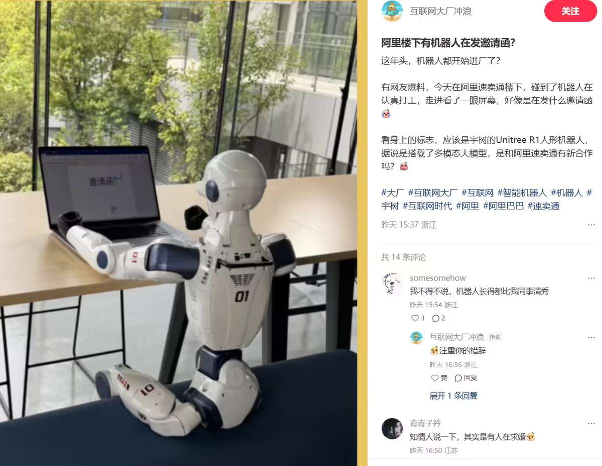 2026年4月9日,据知情人士透露,宇树科技与阿里巴巴正酝酿一项重要的出海战略合作。宇树科技最新款机器人R1近日出现在阿里西溪园区,坐在公共区域一台电脑前呈"打字"状态,电脑屏幕上显示着"邀请函"三个字,并有宇树工作人员随行。