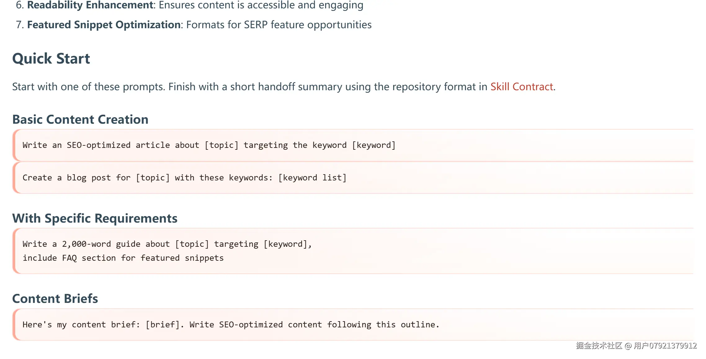 seo-content-writer 这个 Skill 把这些前置工作全部内化成了 AI 的工作流。你只要告诉它你要写什么主题、目标平台是哪里,它会自己按一套完整的清单跑下来:先确认目标关键词和长尾词、分析 SERP 前十名的内容空缺、按 H1—H2—H3 的层级搭出骨架、保证核心答案出现在前 150 字、每 500 字至少加一条外部引用、最后落地成一篇带 TL;DR 摘要的成稿。