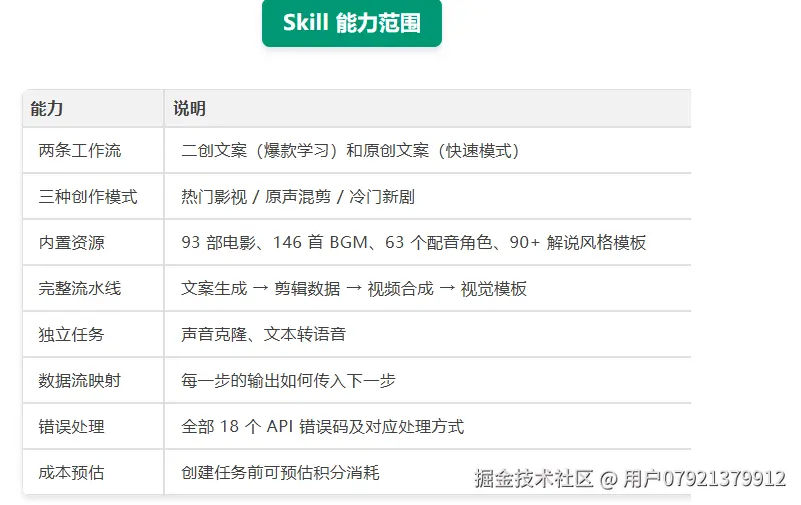 需要提一点,使用前需要配置一个 API Key,作者在 README 里留了获取方式,可以去申请。我自己跑下来感觉这个 Skill 比较适合两类人:一类是已经在做电影/短剧解说的账号运营者,想把产能从一天两条提升到一天二十条;另一类是想入局但被剪辑门槛劝退的新手,因为它真的不需要任何剪辑技能。