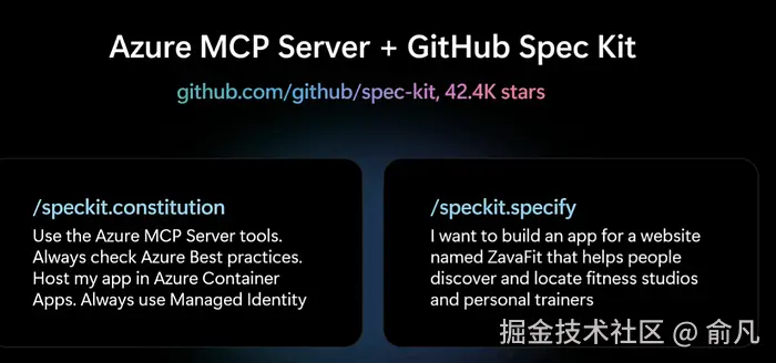 在跳到构建阶段之前,我想强调一个真正改变我处理新应用方式的工作流。它结合了 VS Code、GitHub Copilot、Azure MCP Server 和 SpecKit,这是 GitHub 上用于规格驱动开发的开源项目。
