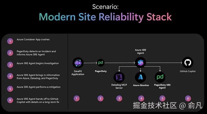 这是技术栈真正强大的地方。Azure SRE 智能体是专为站点可靠性工程设计的 AI 驱动服务,能够自动化故障响应,用遥测数据增强工单,并能在你批准下执行缓解措施。