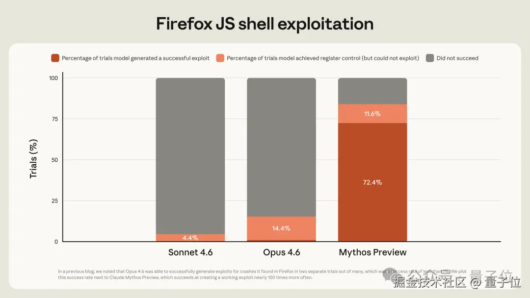 针对 Firefox JS 引擎的漏洞利用测试,上一代旗舰 Opus 4.6 勉强成功了 2 次,而 Mythos 的成绩是 181 次……