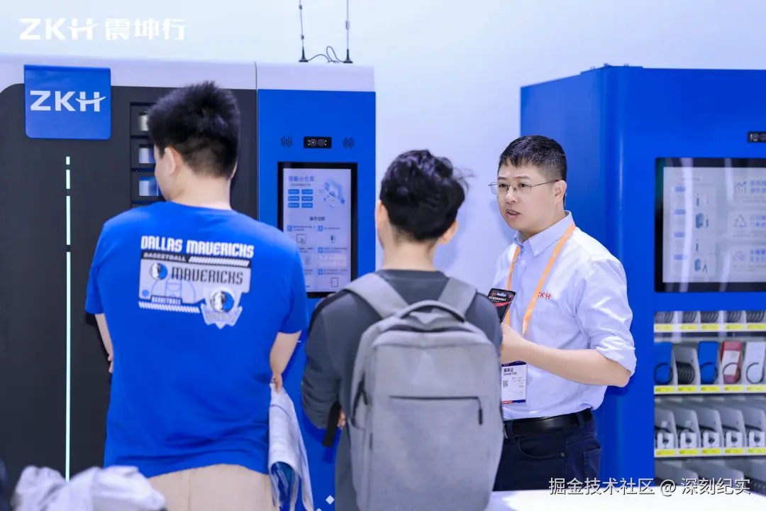 智能仓储展区则展示震坤行最新的智能仓储解决方案。通过模拟布放在产线旁的智能小仓库,展示了员工自助领用、系统自动鉴权、库存实时监控、缺货自动预警补货的一体化流程。有效解决企业物料管理成本高、效率低的痛点,为企业实现降本增效提供了清晰路径。