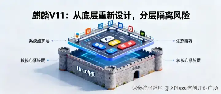 麒麟 V11 从底层重新设计,分为三层,严格隔离风险: