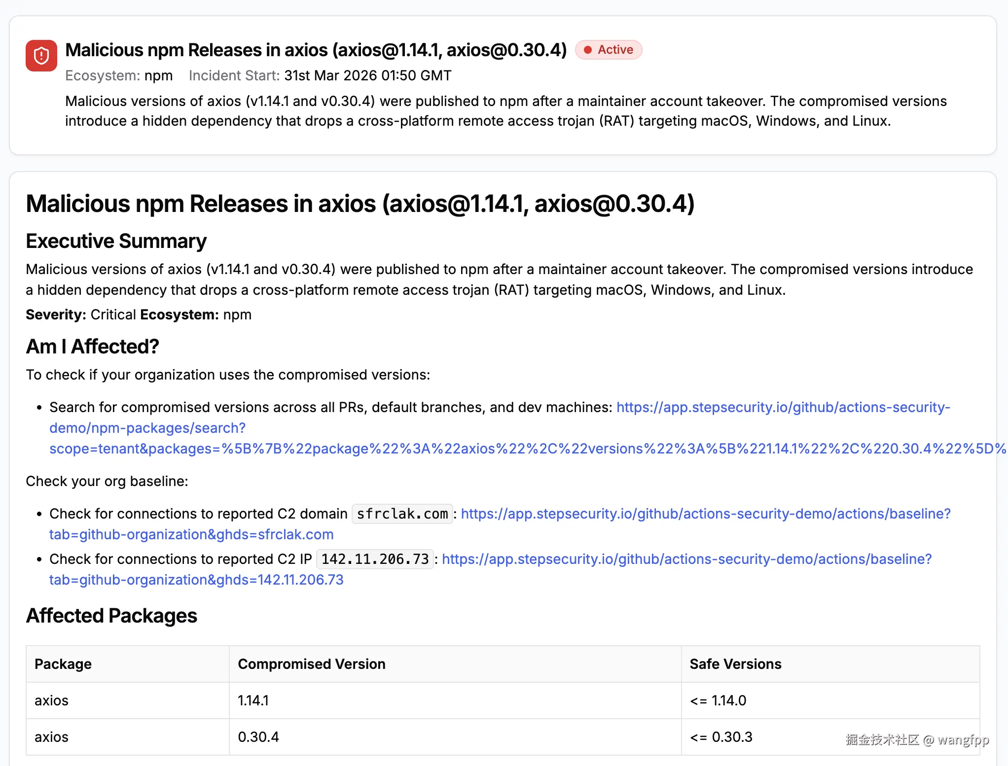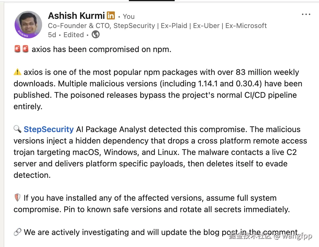 我们发布了一篇 博文, 总结了我们的发现,包括被入侵的版本(1.14.1 和 0.30.4)、注入的 plain-crypto-js 依赖项以及 C2 域名。Ashish 在 LinkedIn 上发布了一份安全公告,详细分析了入侵的关键指标,以便浏览其动态的开发者能够看到此警告。
