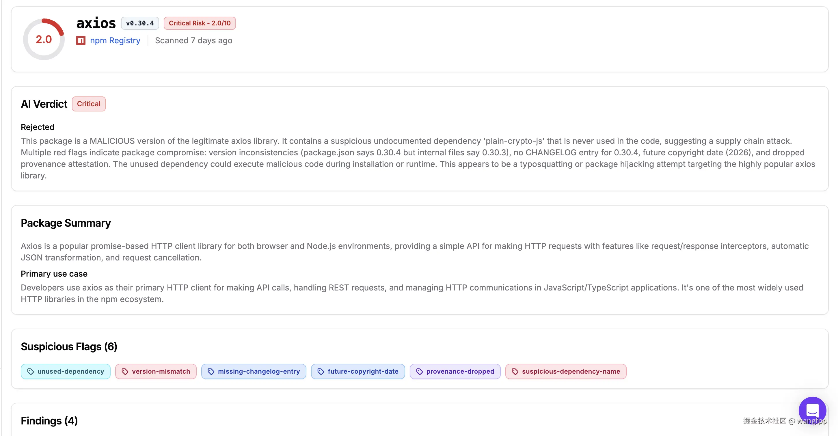 被篡改的 axios 包发布到 npm 后,StepSecurity 的 AI 包分析器 立即对其进行了实时分析,并返回了 “严重/已拒绝” 的判定结果。结论非常明确:这是一个恶意版本的合法 axios 库,明显显示出通过包劫持导致供应链遭到破坏的迹象。自动化分析标记了六个不同的可疑指标,例如:一个未记录且未使用的依赖项 (plain-crypto-js),该依赖项从未在源代码中任何地方被导入;package.json 文件与内部版本数据不匹配;缺少 CHANGELOG 条目;以及遗漏了来源证明。