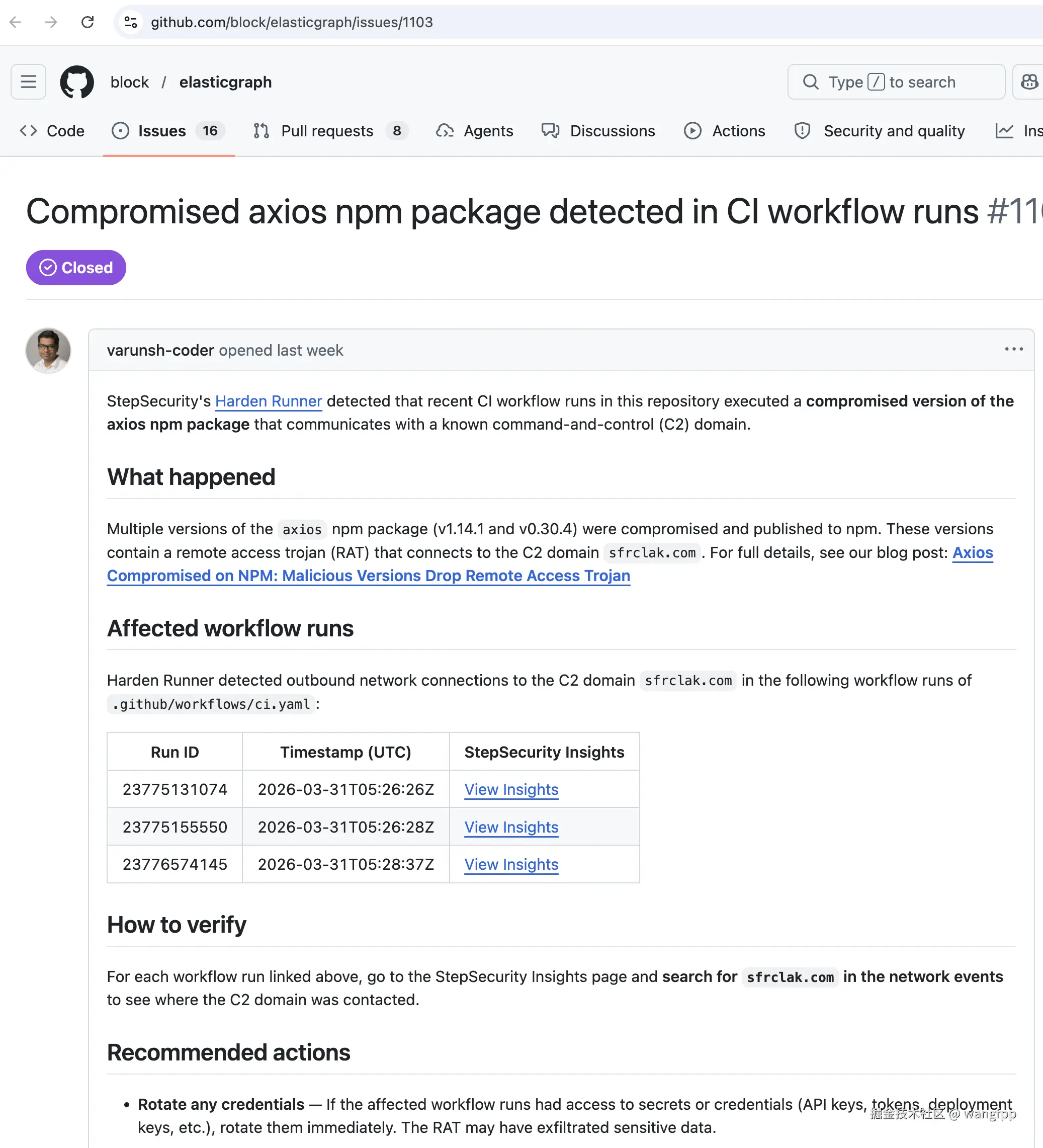 在 GitHub 上,#10604 号 issue 成为了应对此次事件的实际协调中心。社区成员贡献了取证细节,共享了检测脚本,就修复方案提出并解答了问题,并互相帮助评估自身面临的风险。在被盗账户被封禁后,axios 项目的其他合作者夜以继日地工作,以恢复用户对该软件包的信任,发布了干净的版本,并与用户群体保持透明的沟通。