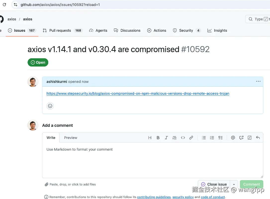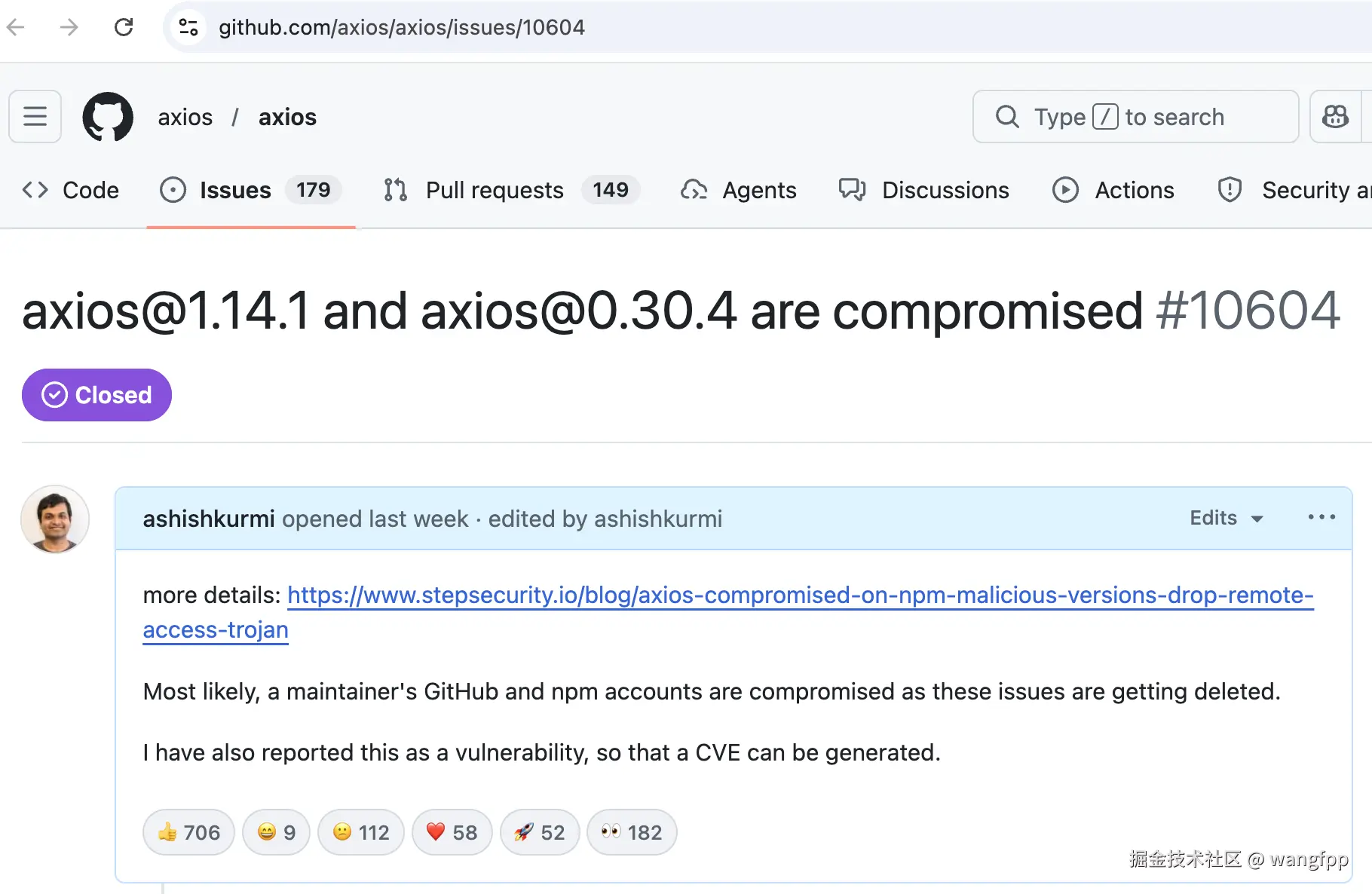 然后 Ashish 转向 axios GitHub 存储库,创建了一个问题,以便与维护者合作,提醒社区。